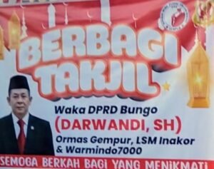 Jum’at Berkah 13 maret 2026 Kegiatan berbagi takjil di bulan suci Ramadhan kembali dilakukan sebagai bentuk kepedulian terhadap masyarakat. Wakil Ketua DPRD Kabupaten Bungo Darwandi, SH, bersama Ormas Gempur, LSM Inakor, dan Warmindo7000 menggelar kegiatan berbagi takjil kepada para pengendara dan masyarakat yang melintas.