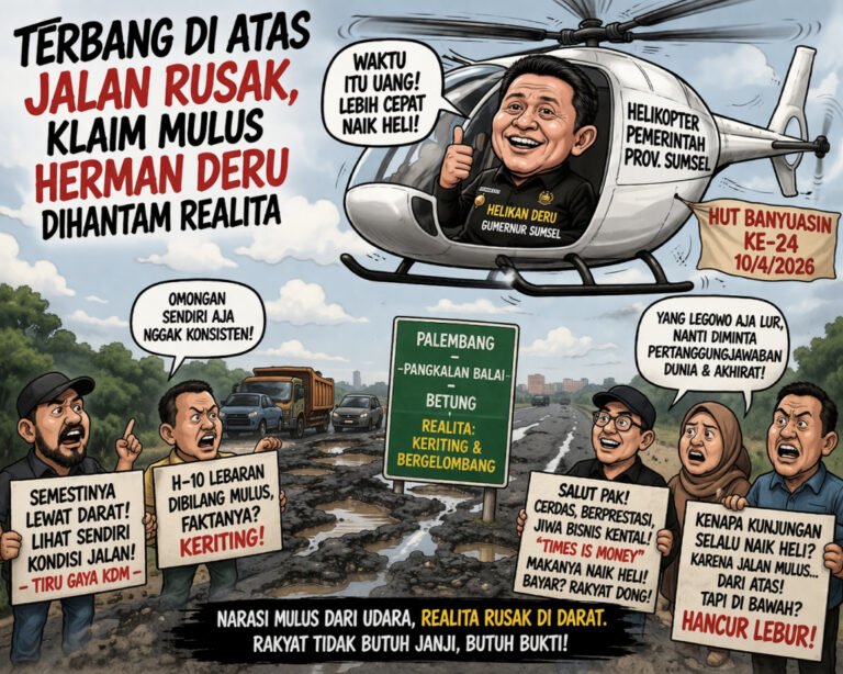 BANYUASIN , INFOMUSI.COM, — Narasi “jalan mulus” yang sebelumnya digaungkan Gubernur Sumatera Selatan, Herman Deru, kini berbalik menghantam. Di saat sejumlah ruas strategis dilaporkan masih rusak dan bergelombang, pilihan sang gubernur menggunakan helikopter saat kunjungan ke Banyuasin justru memantik kecurigaan publik: ada realita yang tak ingin dilihat dari bawah.