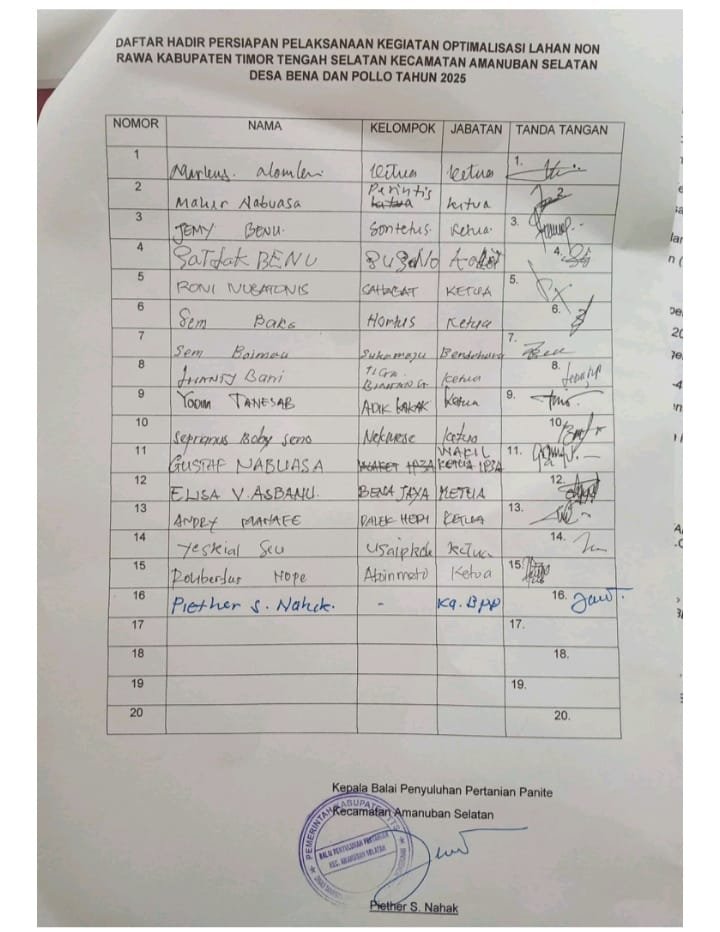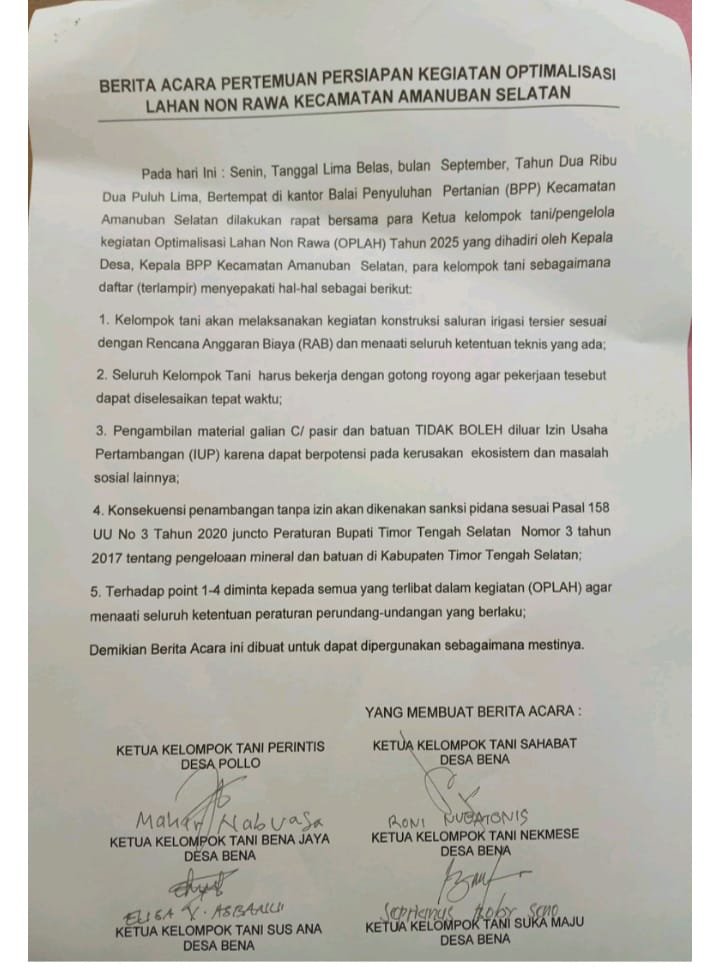 melakukan rapat bersama para ketua kelompok tani/ pengelolah kegiatan oplah non rawa tahun anggaran 2025, yang dihadiri oleh kepala desa bena, kepala BPP kecamatan Amanuban Selatan dan para ketua kelompok tani penerima manfaat oplah non rawa menyepakati hal hal sebagai berikut;