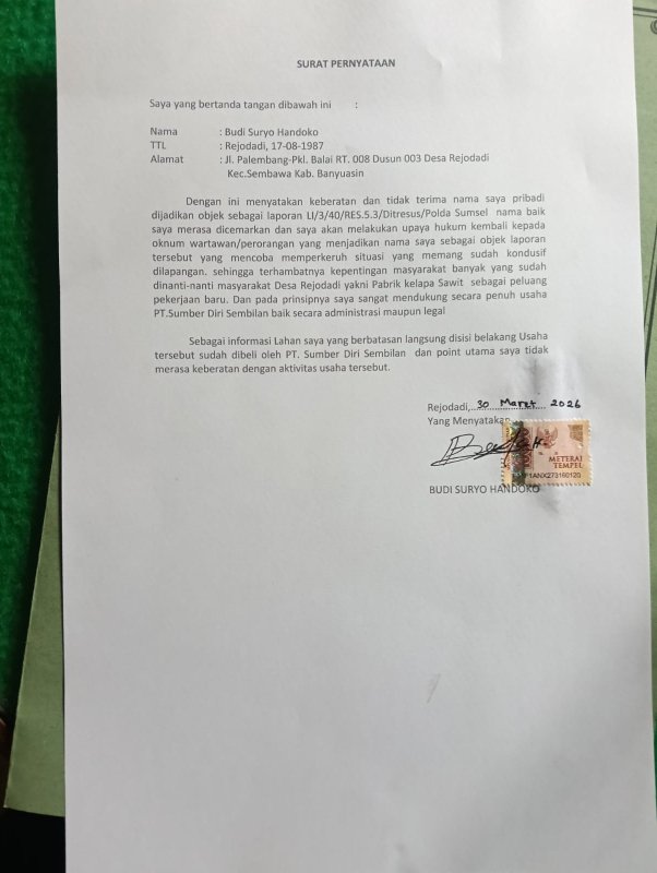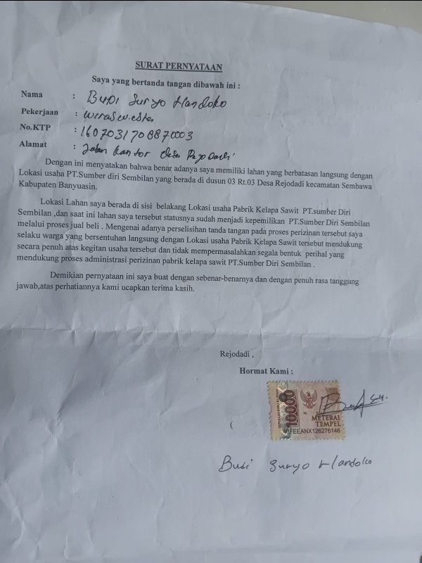 Terkait perihal usaha Pabrik Kelapa sawit PT.SDS sudah mendapatkan persetujuan dari tokoh masyarakat warga Rejodadi yang di hadiri kepala desa Rejodadi dan camat Sembawa melalui pertemuan di balai desa.